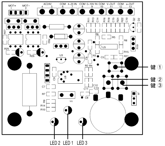 | 智能型調(diào)試說明: ◆ 長按“鍵①”,“LED1”燈亮,再次按“鍵①”,“LED1”燈閃一次將進(jìn)入行程自動標(biāo)定程序; ◆ 長按“鍵②”切換正反轉(zhuǎn)。“LED2”燈亮為正轉(zhuǎn)型,“LED2”燈滅為4-20mA電流; ◆ 長按“鍵③”切換電壓電流輸入。“LED3”燈亮為0-10V電壓,“LED3”燈滅為4-20mA電流; ◆ 接線完成必須進(jìn)行行程標(biāo)定,以確保閥按給定的信號準(zhǔn)確動作。 ![]() |